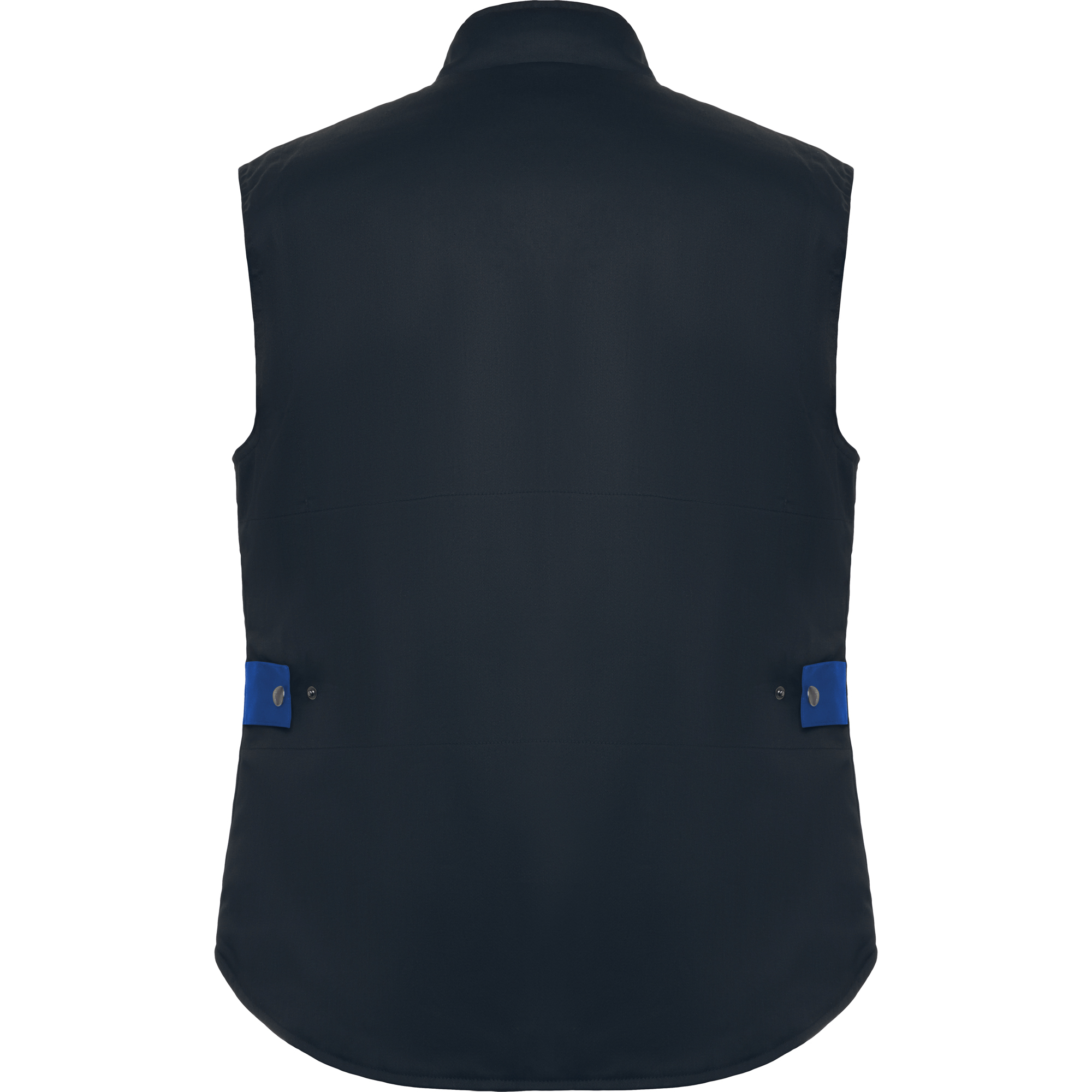 Chaleco laboral multibolsillos con cuello alto en colores combinados.