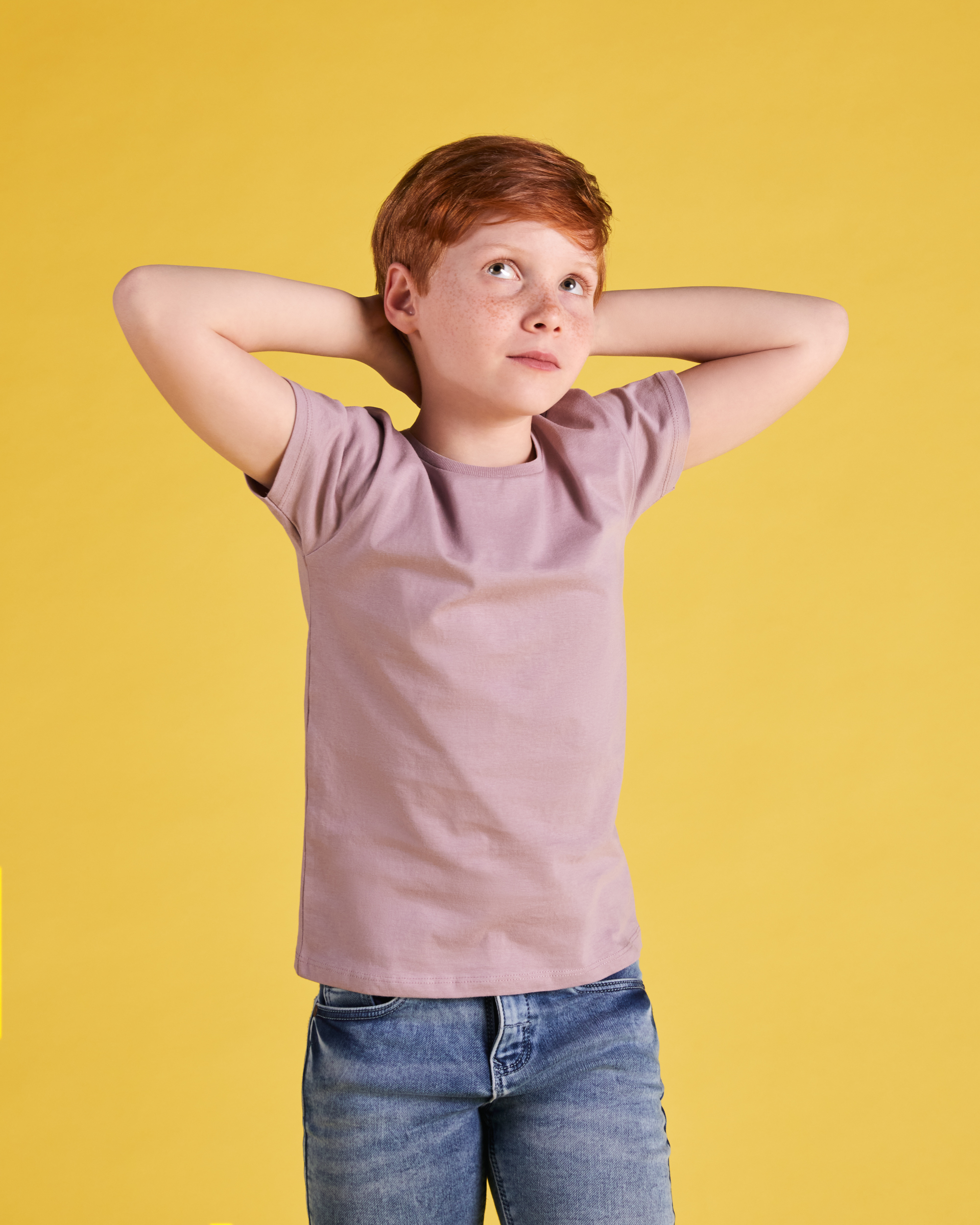 Camiseta tubular de manga corta en algodón orgánico certificado OCS. Cuello redondo en canalé 1×1. Cubrecosturas reforzado en cuello.
