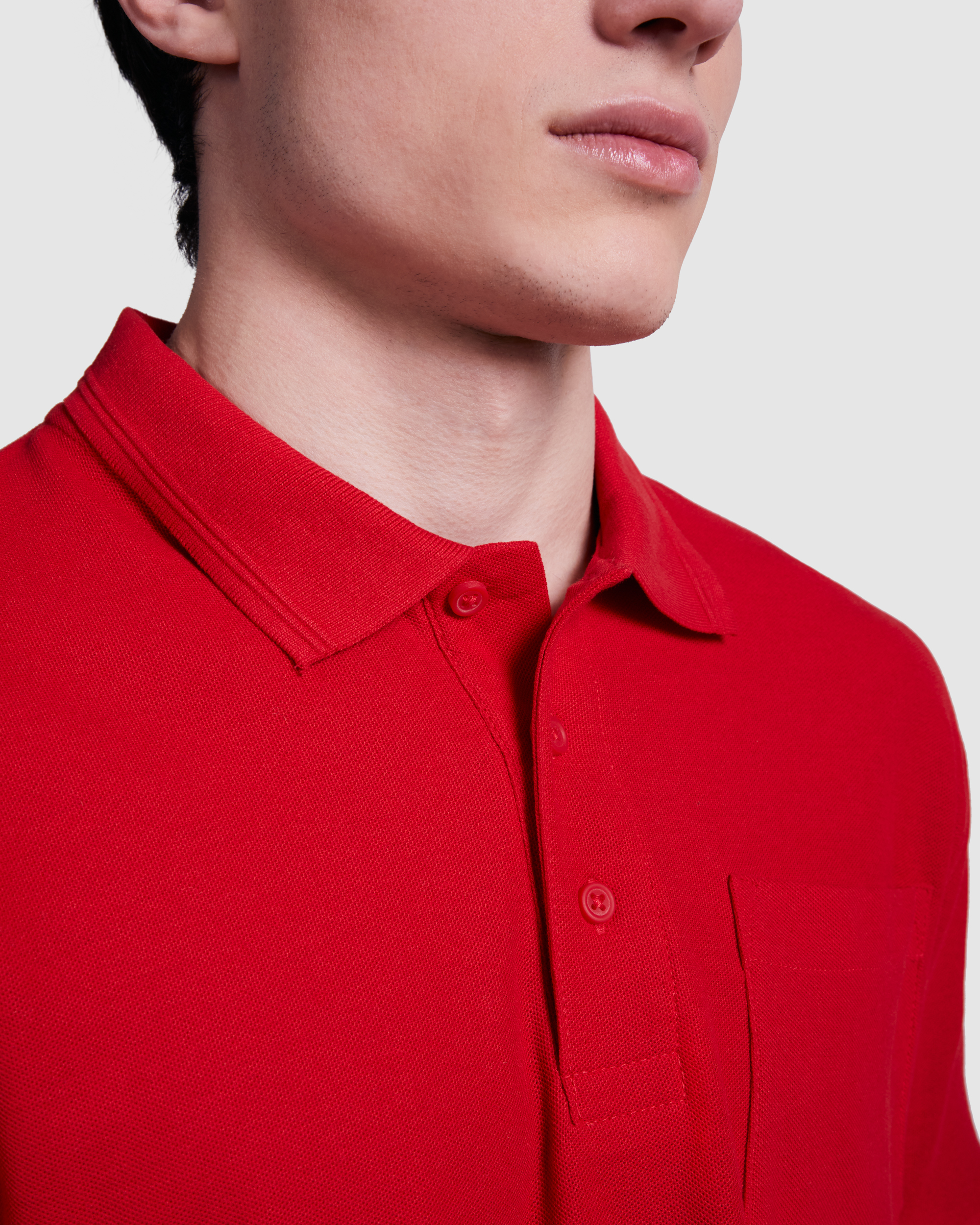 Polo de manga corta con bolsillo en pecho izquierdo. Cuello y ribete de manga en canalé 1×1 con detalle en relieve. Tapeta con 3 botones. Cubrecosturas reforzado en cuello.