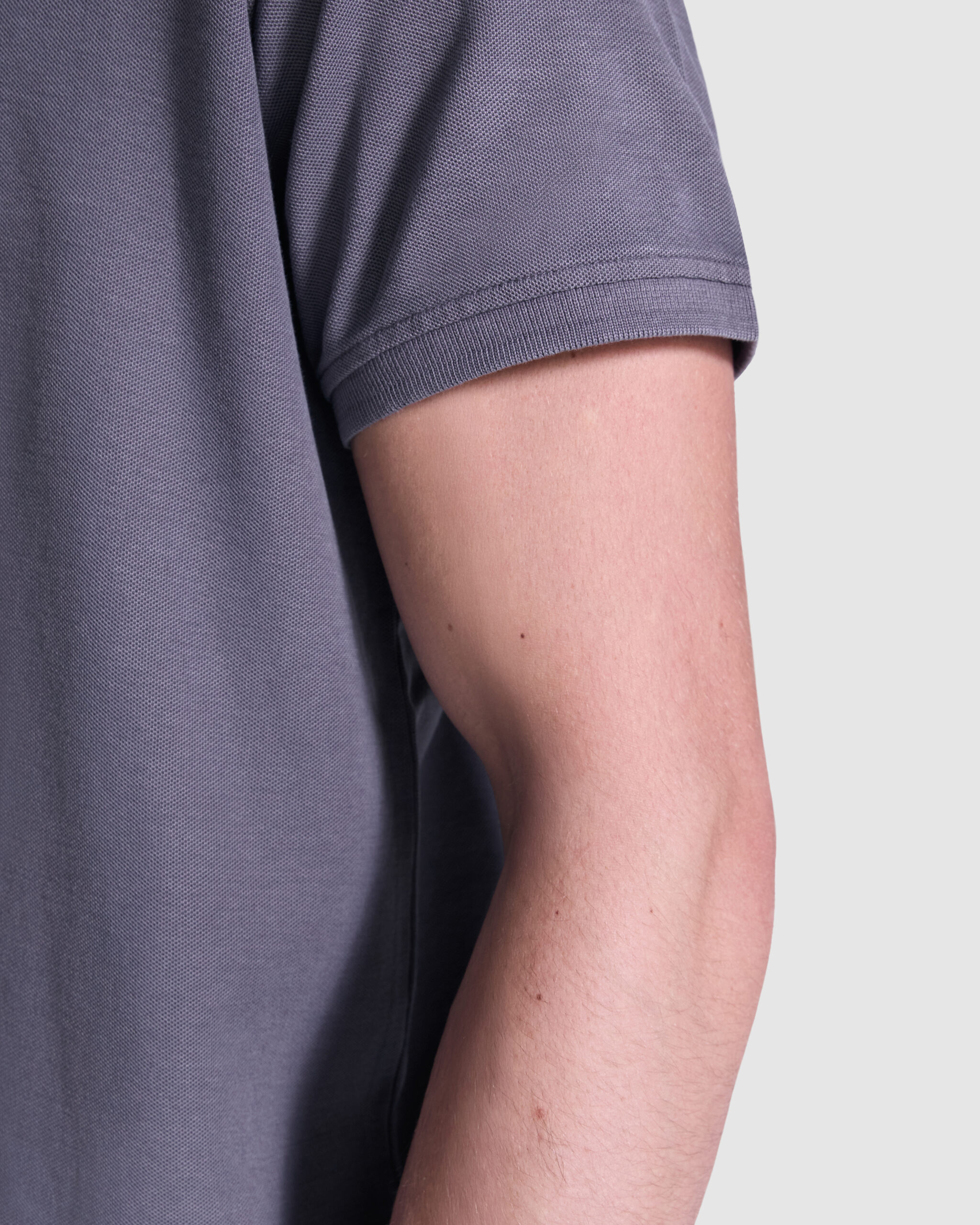 Polo de manga corta unisex, 100% algodón con acabado lavado ácido. Cuello y mangas en rib 1×1, con aperturas laterales. Cubrecosturas al tono. Tapeta con tres botones.