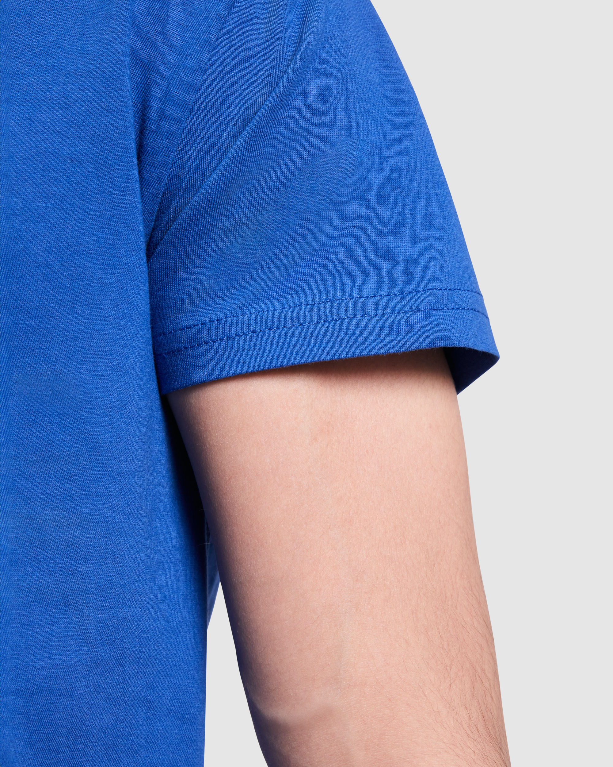 Camiseta de manga corta tubular y escote en pico de 2 capas. Cubrecosturas reforzado en cuello y hombros.