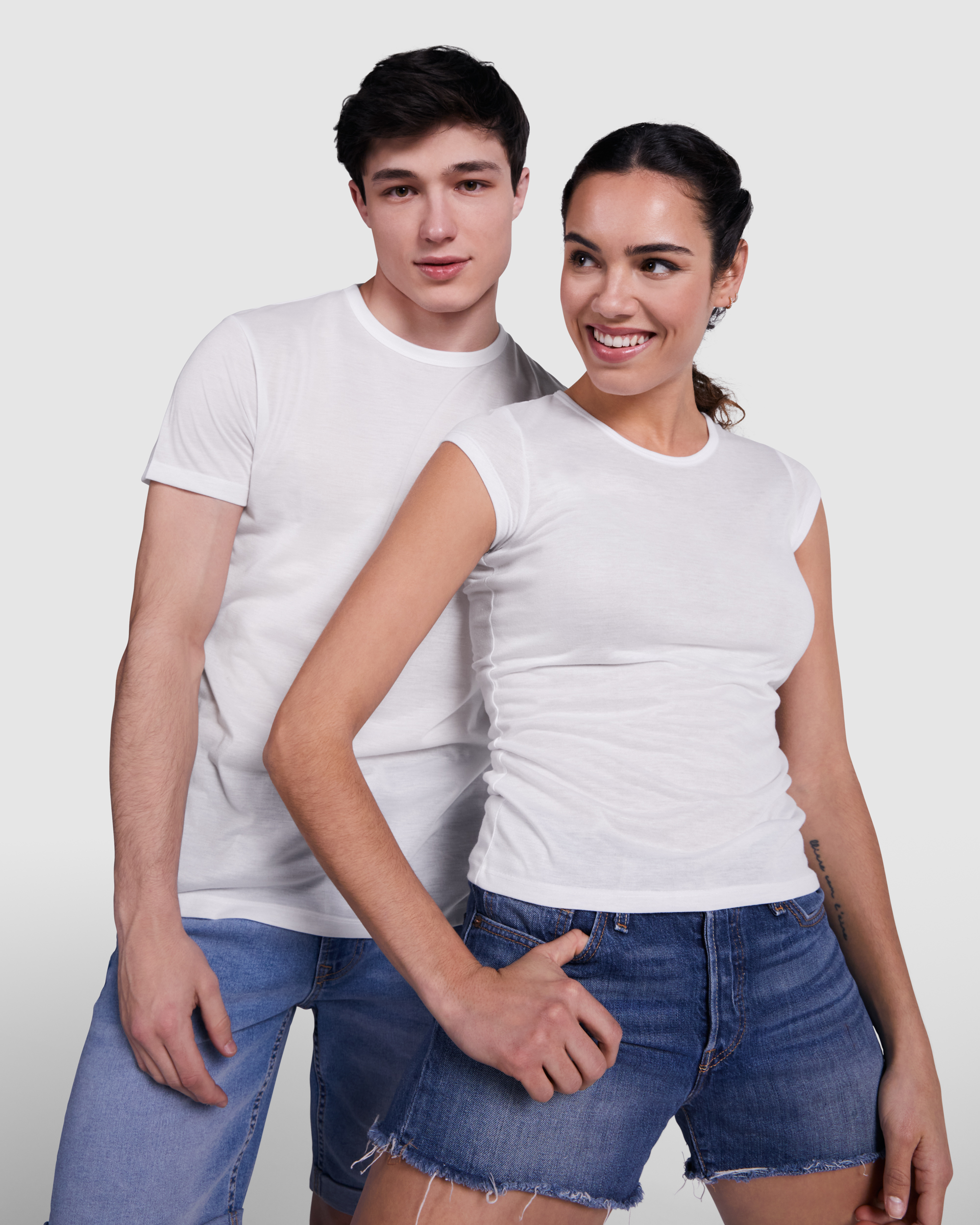 Camiseta de manga corta con cuello redondo ribeteado en el mismo tejido y costuras laterales. Fabricada en tejido de poliéster con tacto algodón. Idónea camiseta para sublimación.