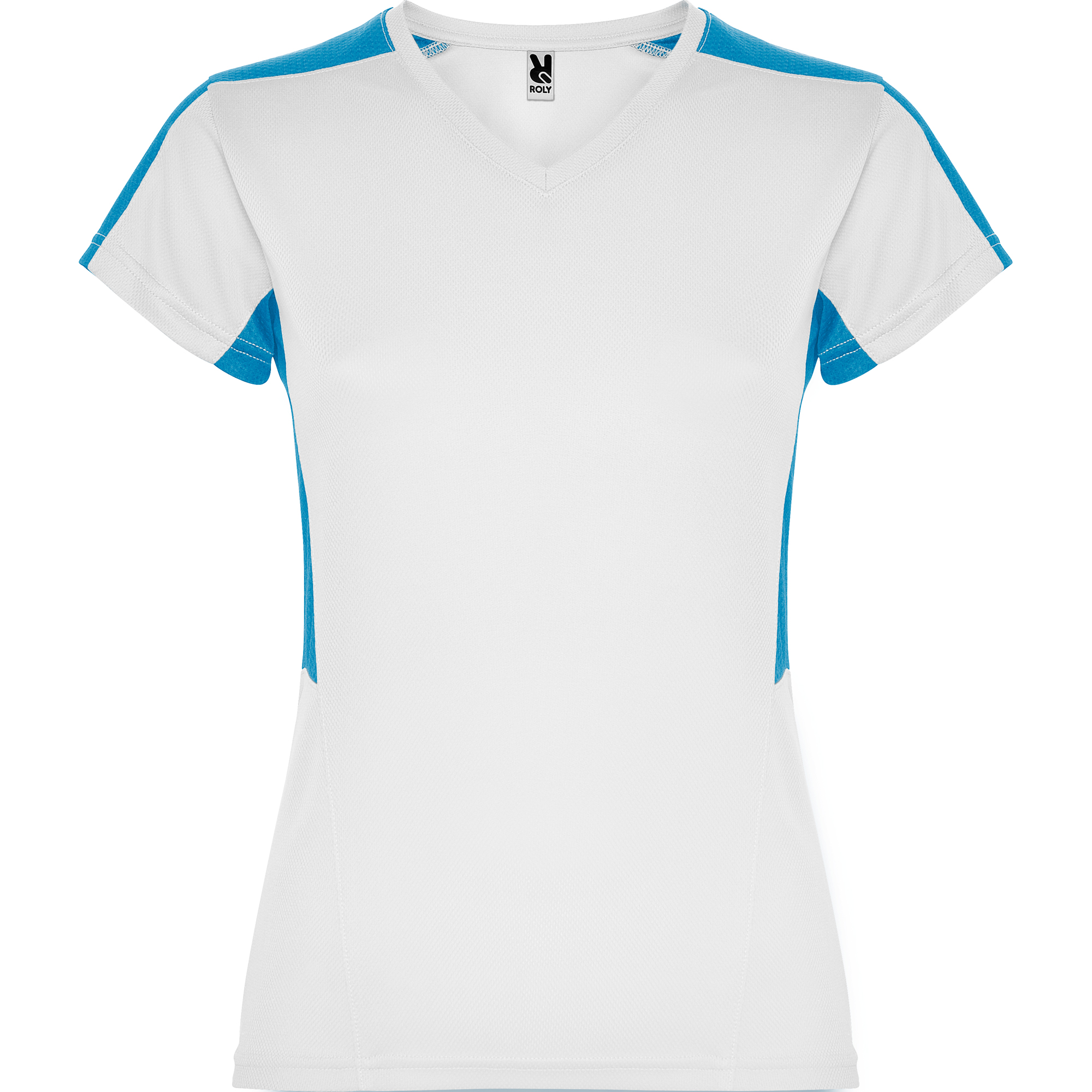 Camiseta técnica de manga corta para mujer con cuello pico. Combinada en laterales y hombros con dos tejidos de poliéster. Tejido principal bird´s eye y tejido rejilla 3D transpirable en hombros y paneles laterales. Tejido preparado para la absorción de humedad.