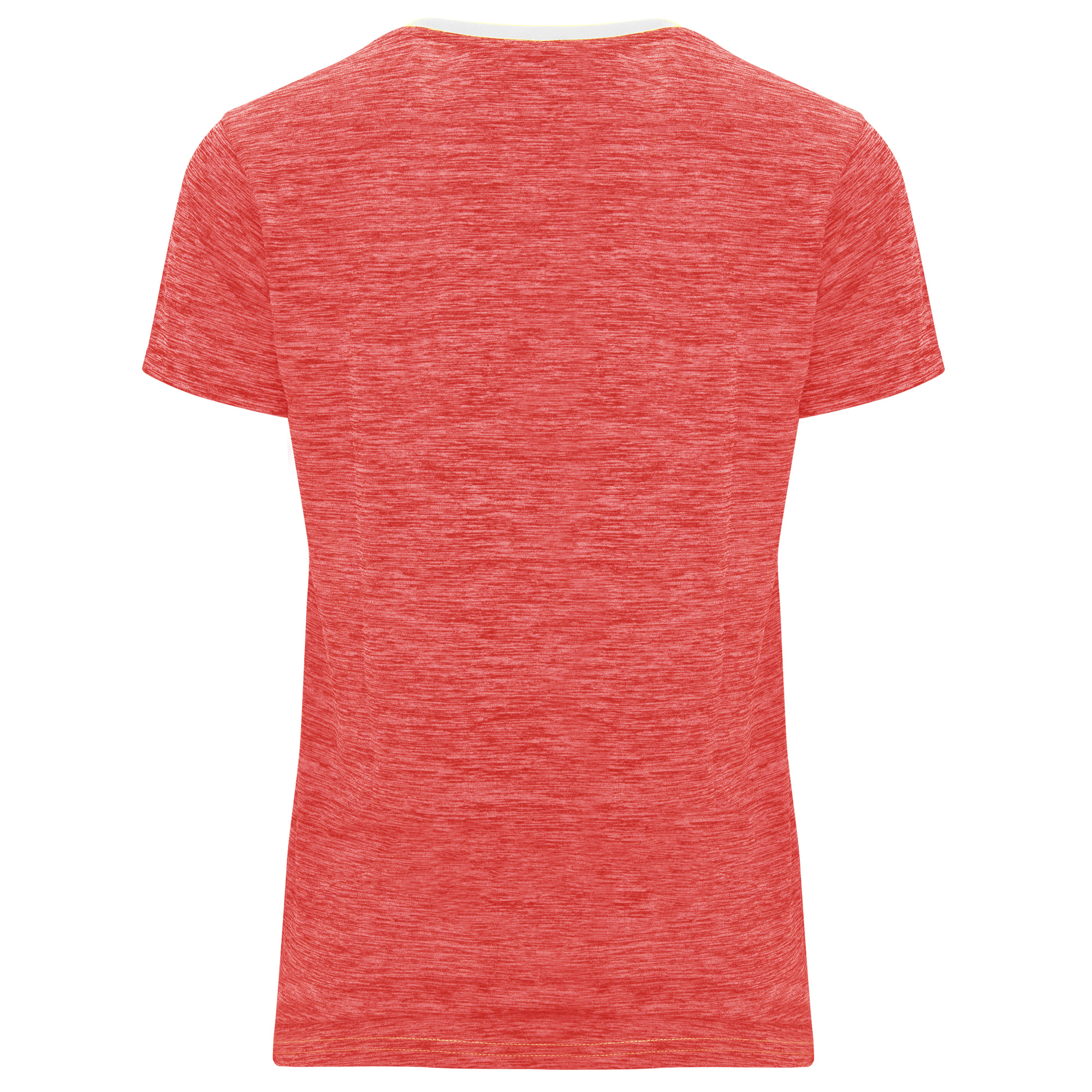 Camiseta técnica de manga corta para mujer, con cuello redondo. Combinado en espalda, hombros y mangas con dos tejidos de poliéster. Tejido principal frontal bird´s eye y tejido space dye en la parte trasera. Patronaje en la espalda ligeramente mas largo.